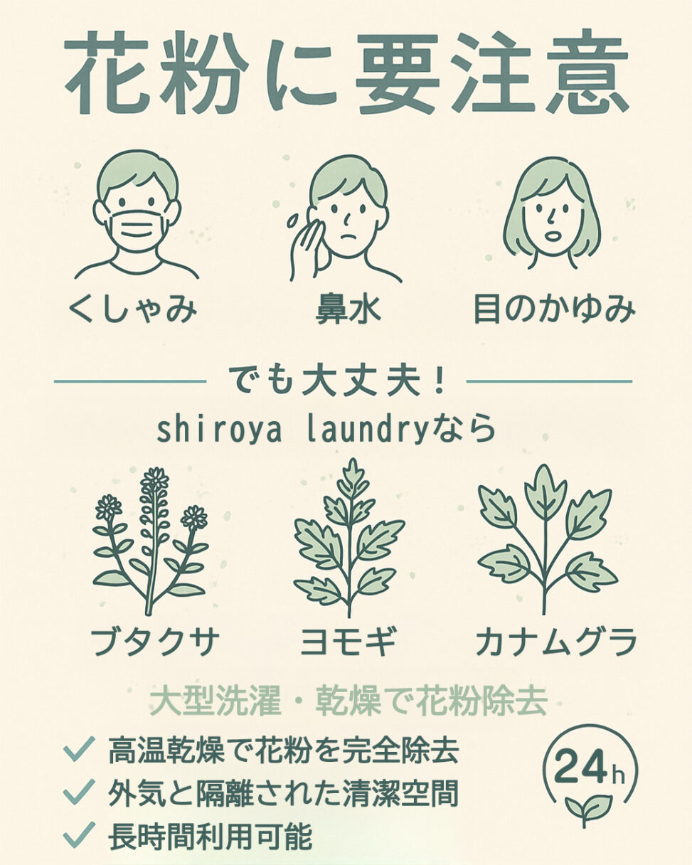 shiroya laundryは、皆様の快適な秋のライフスタイルを24時間サポートいたします。花粉対策、ぜひshiroya laundryにお任せください。