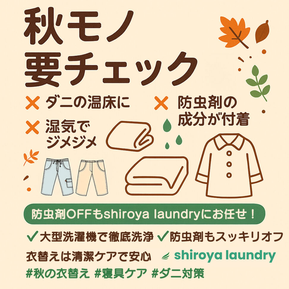 こんにちは、shiroya laundryです。秋の訪れとともに、衣替えの季節がやってきました。しまっていた秋物を出したら、意外な問題に直面していませんか?今回は、秋物衣類や寝具を出す際に注意すべきポイントと、shiroya laundryでの効果的なケア方法をご紹介します。